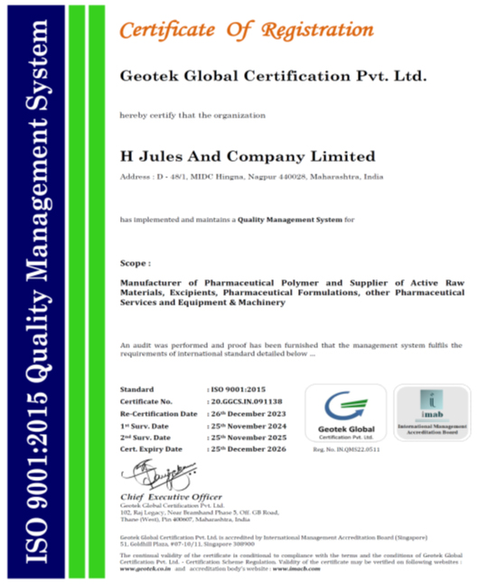 In 2019, H Jules and Company Limited made a strategic transformation by establishing its own GMP and ISO 9001:2015 certified pharmaceutical polymer manufacturing unit, shifting from trading to specialized manufacturing. This milestone positioned us as a dedicated solutions provider in drug-delivery coatings for oral solid dosage forms.